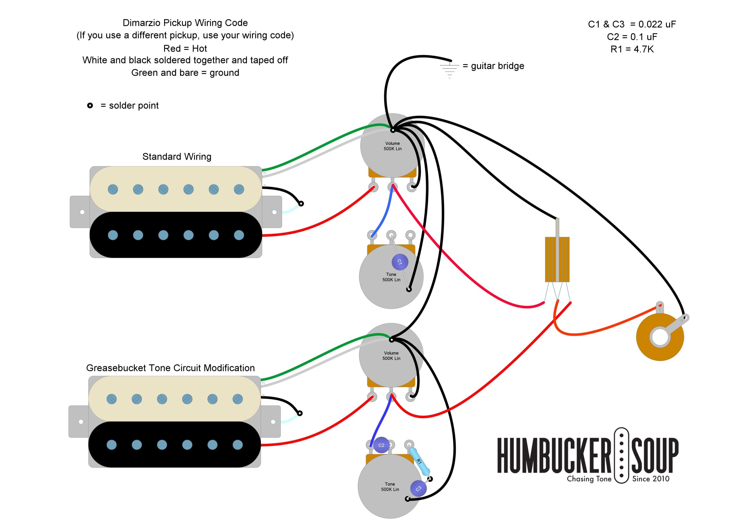 The Greasebucket Tone Control circuit uses two capacitors instead of the single capacitor we find in the standard tone control circuit, along with a resistor. Fender suggests a 0.1uF capacitor for removing the low end and a 0.022uFZ capacitor to remove the highs. For the resistor, you will select one with a 4.7K value.