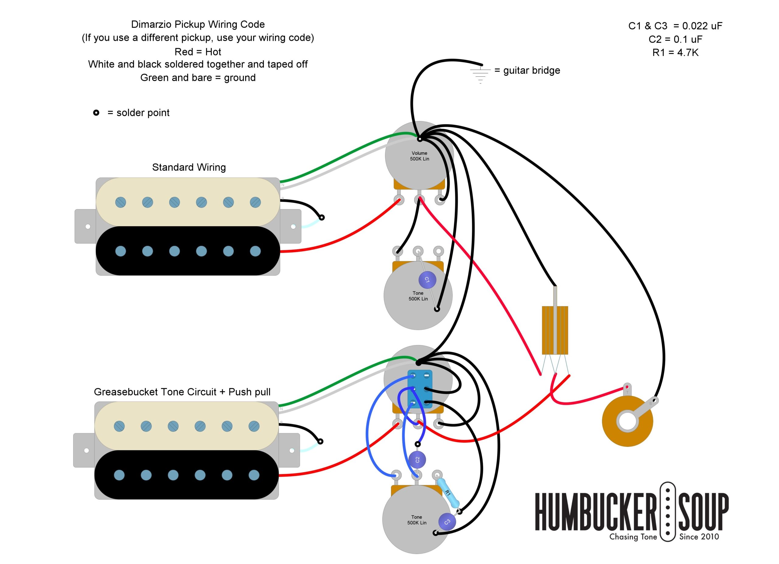 If your guitar isn’t already using push-pull pots for another modification, you can use one to turn the Greasebucket mod on and off. By doing so, your tone control will work like a standard tone control, only filtering out the high frequencies when the tone pot is in the normal position. Then, when you pull it out, the Greasebucket modification will kick in, filtering both the low and high frequencies resulting in its unique tone.